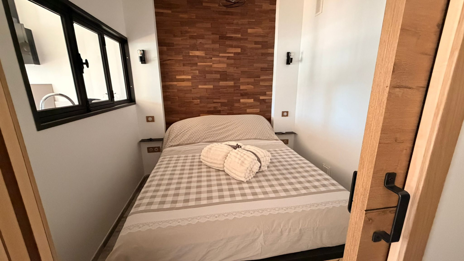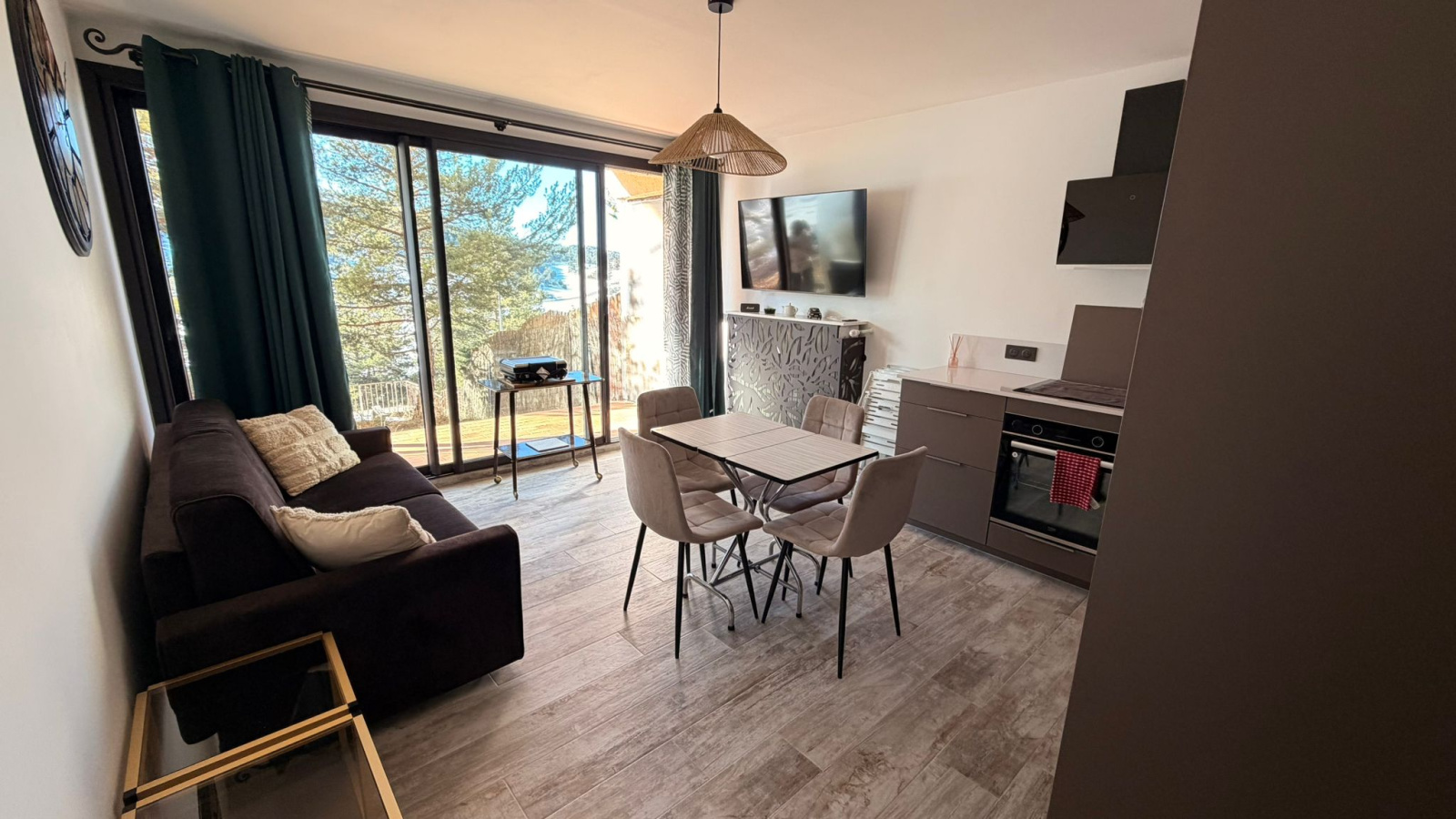 - Un espace de vie lumineux ouvert sur une cuisine équipée (plan de travail en quartz, plaque vitrocéramique, hotte, évier, frigo, lave vaisselle inclus).